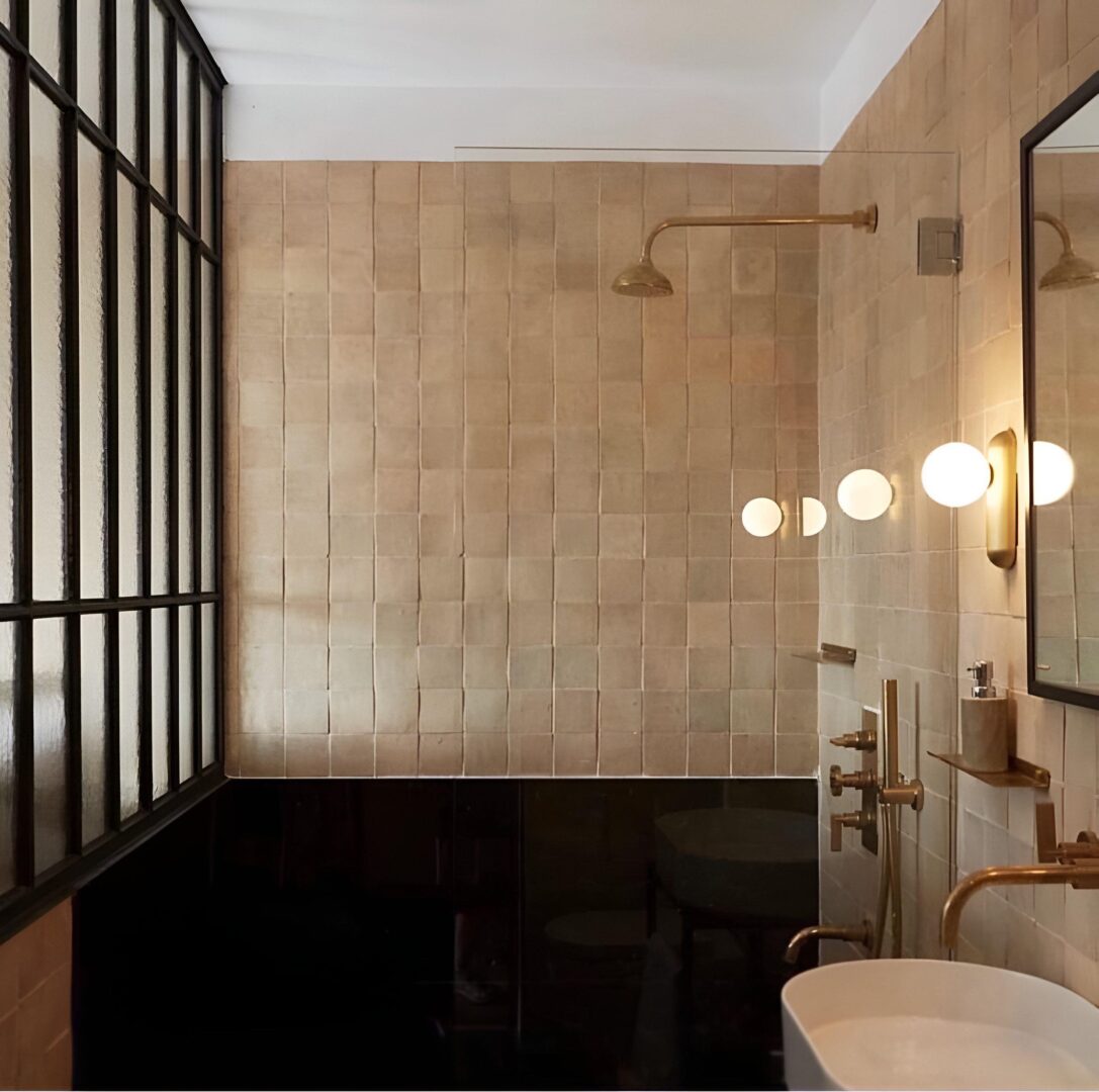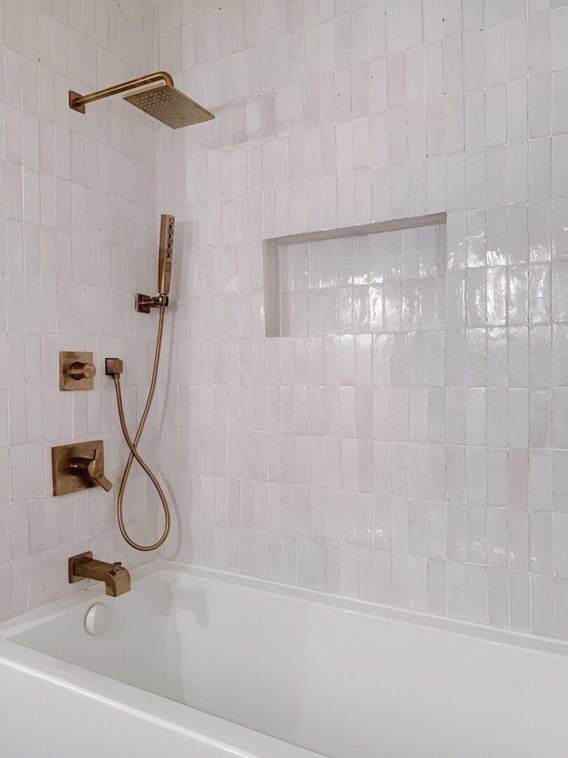 avlångt zellige-kakel med en något transparent vit glasyr där kaklets naturliga färg lyser igenom