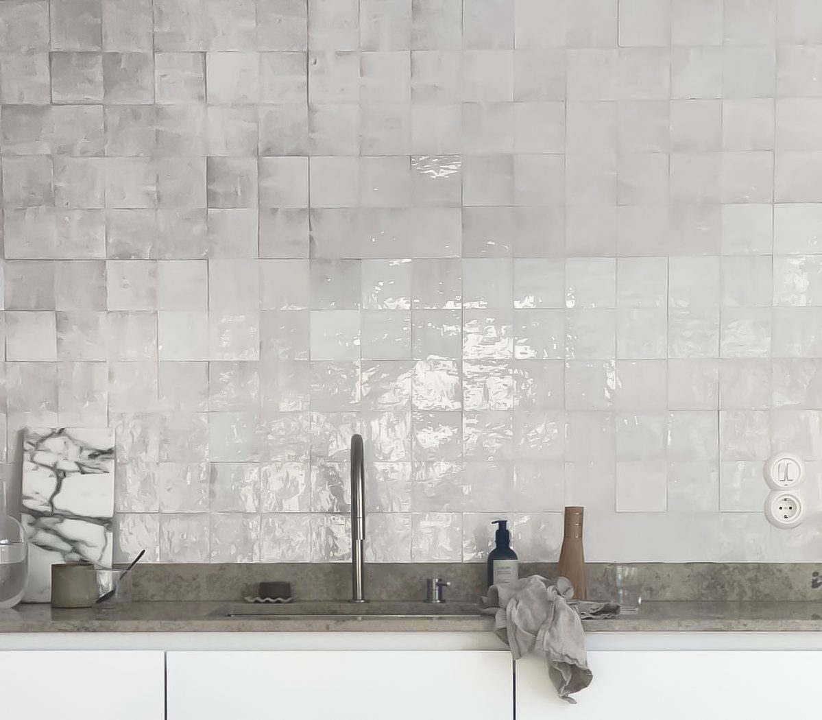 närbild på vita ojämna glansiga zellige-kakelplattor