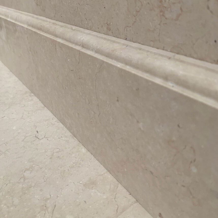 Golvlist Crème kalksten är en slät profilerad list. Crème har en varm mjukt crèmevit nyans med gyllene inslag.
