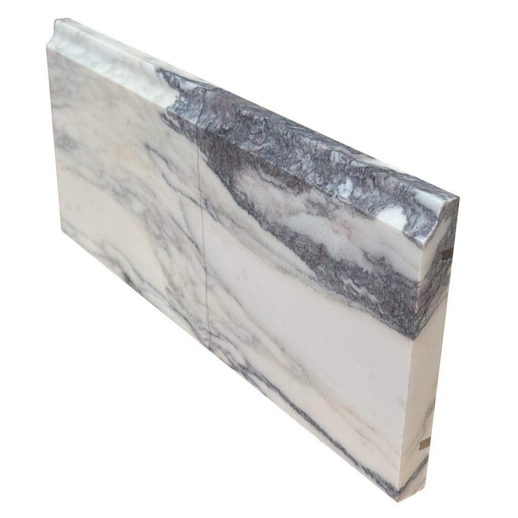 Profilerad bröstlist i Carrara-marmor, en tidlös detalj som ger ett elegant och klassiskt avslut. Den tydliga profilen framhäver marmorns naturliga ådring och ljusa nyanser, och tillför karaktär och stil till rummet.