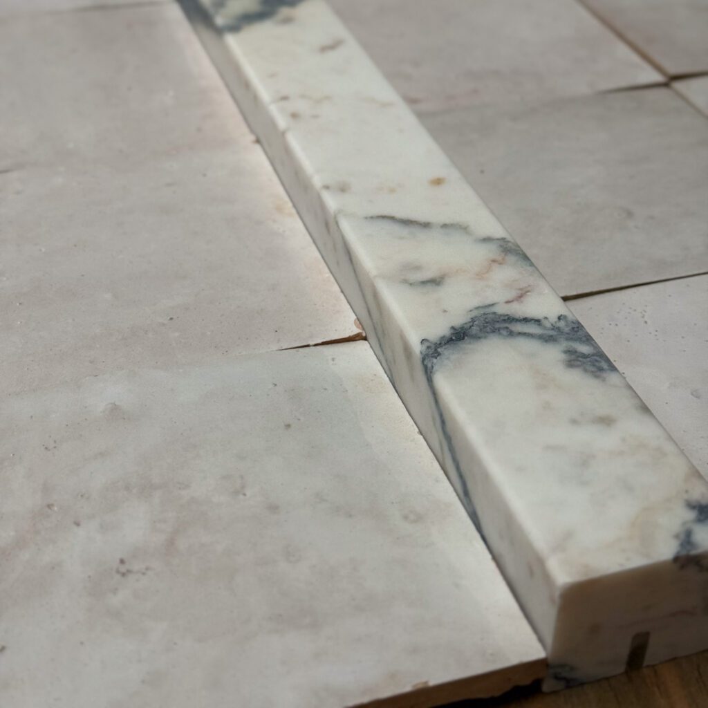 Golvlist i Carrara-marmor, en stilren detalj som ger ett genomarbetat avslut vid golvkanter. Den framhäver marmorns naturliga ådring och ljusa nyanser, samtidigt som den skapar en harmonisk övergång mellan vägg och golv.