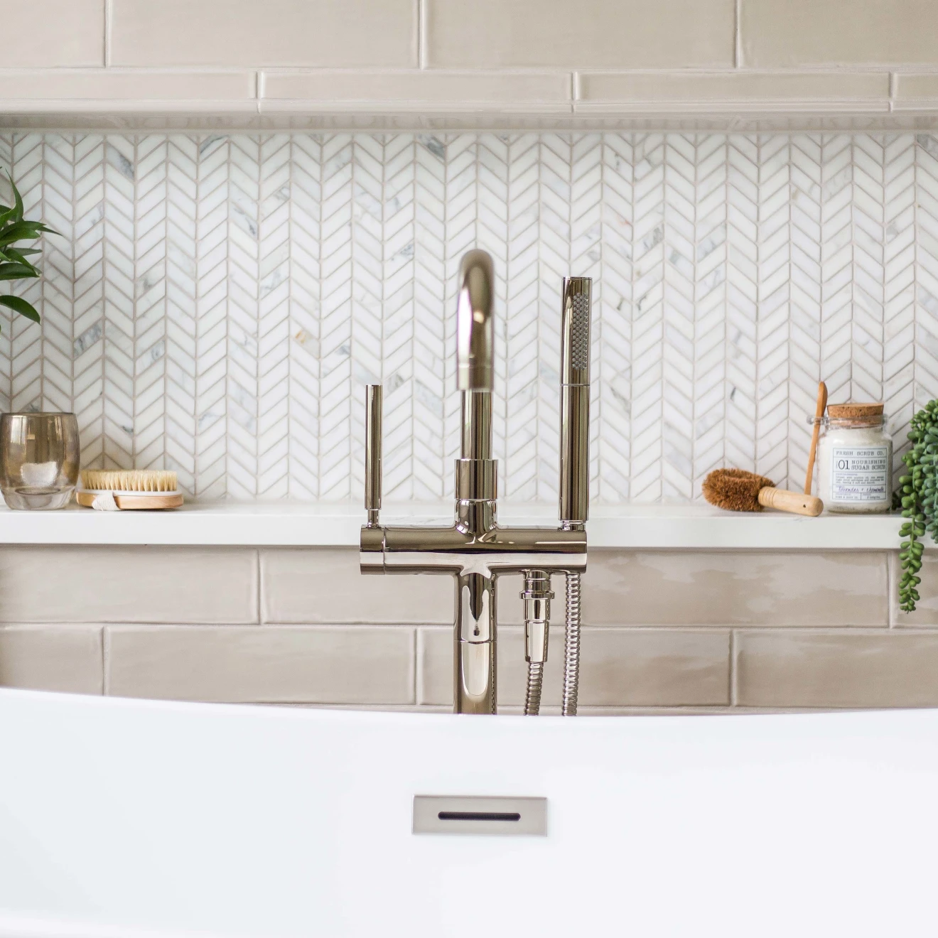 Carrara Marmor Chevron mini. Mosaiken kommer monterad på nät i måttet ca 30×30 cm. Carrara marmor med vit botten och lagom mycket grå marmoreringar, så som vi på stiltje tycker är vackrast. Ytan är matt, så kallad finslipad och kanterna är raka, ej fasade.