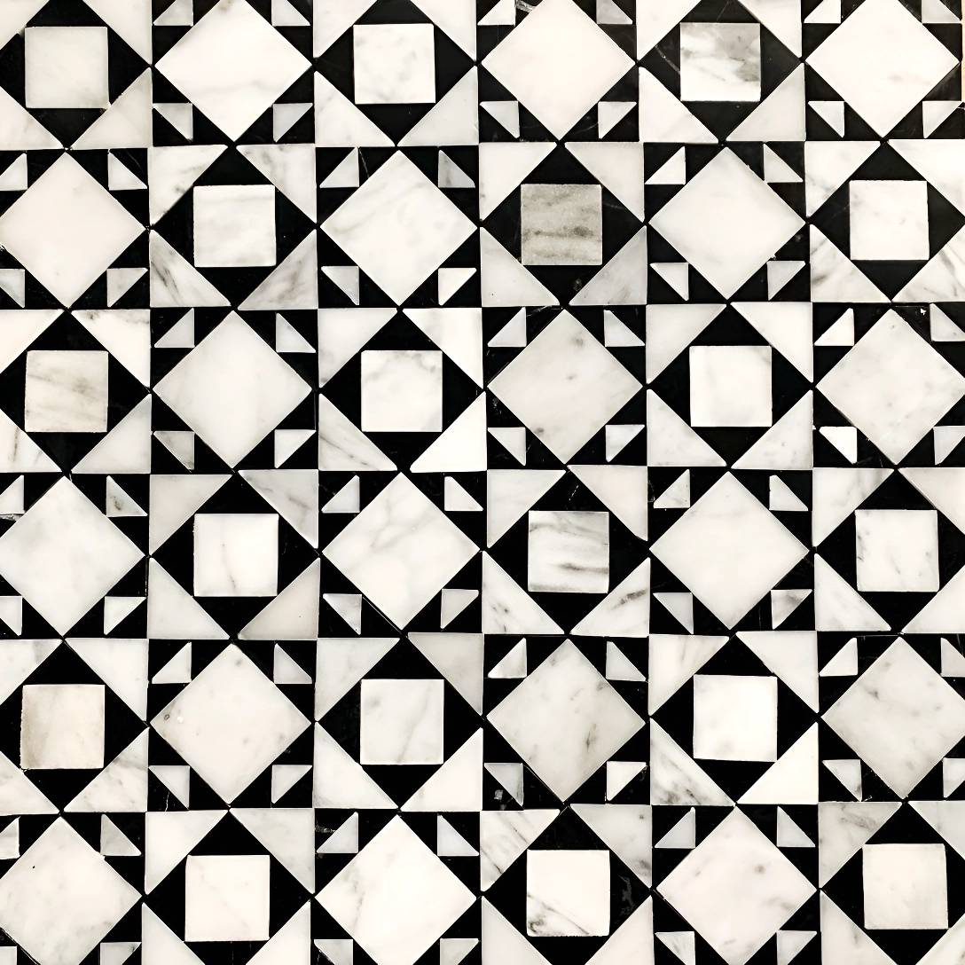 Ethnic marble. Ett hantverk i en blandning av svart och Carrara marmor. Den vita marmorn har ibland lite gråa inslag som ljus Carrara. Varje fyrkant är 5×5 cm och kommer monterad på nät där varje flak är ca 30×30 cm. Mosaiken fungerar bra både på golv och vägg.