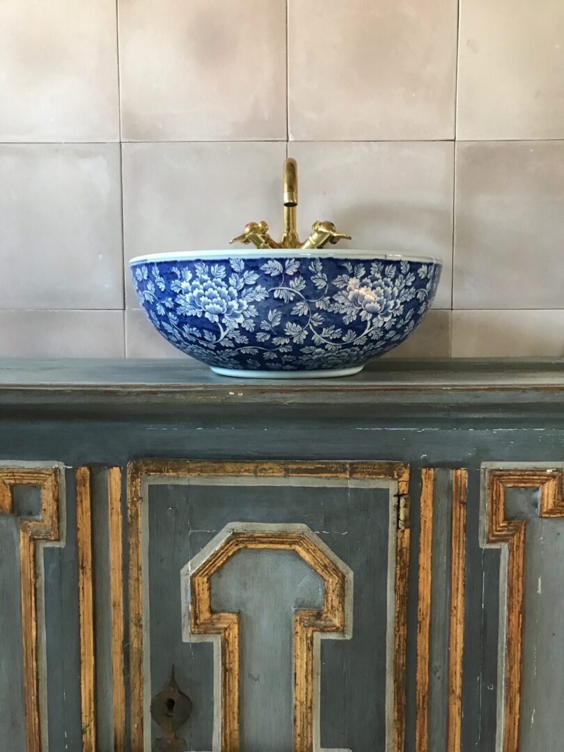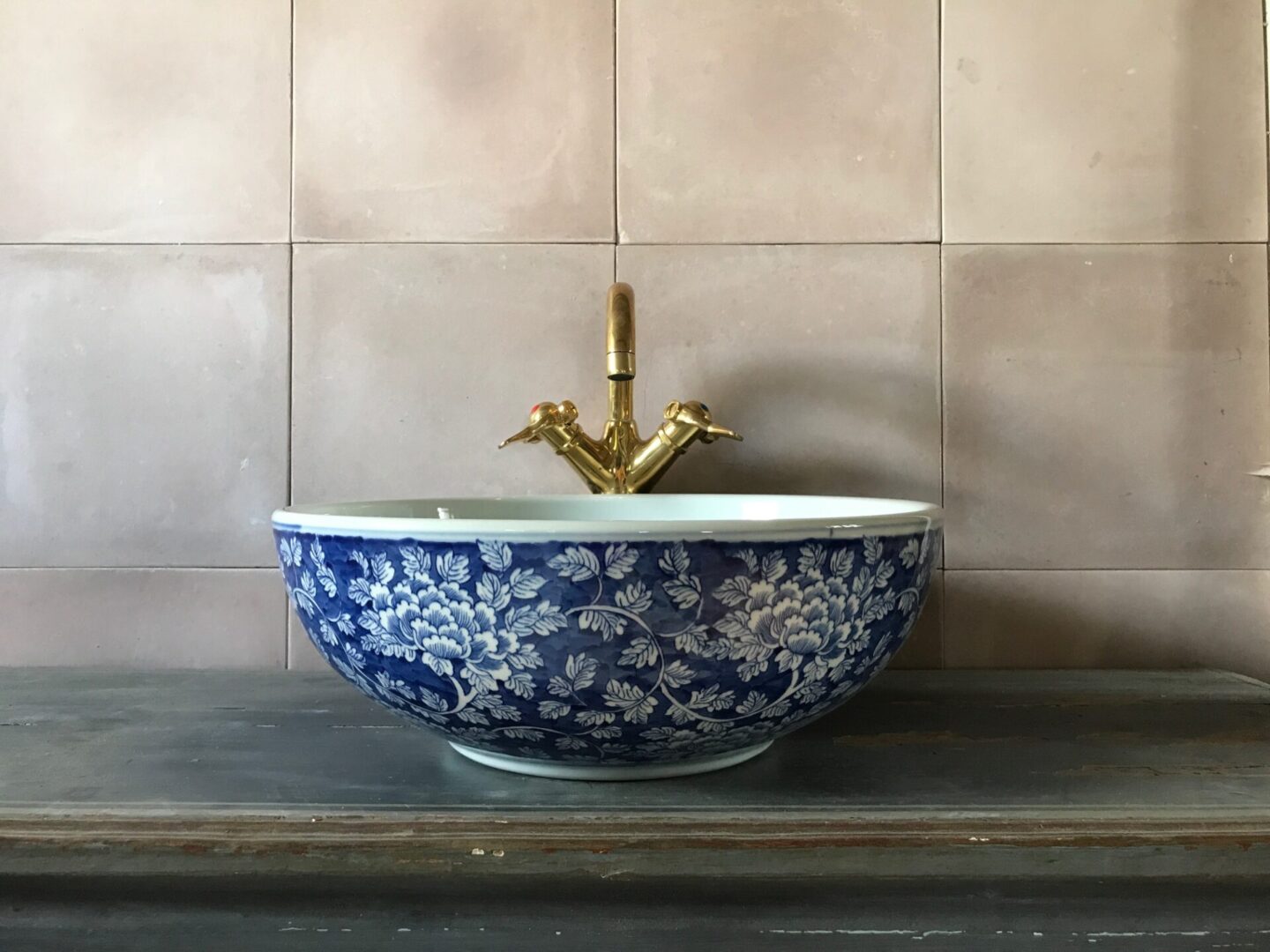 Passar som ovanpåliggande handfat i badrum och gäst-wc där man vill skapa ett tydligt blickfång med blåvitt mönster och klassisk känsla.