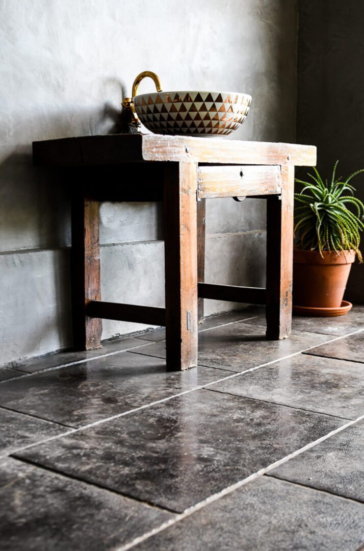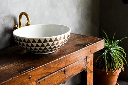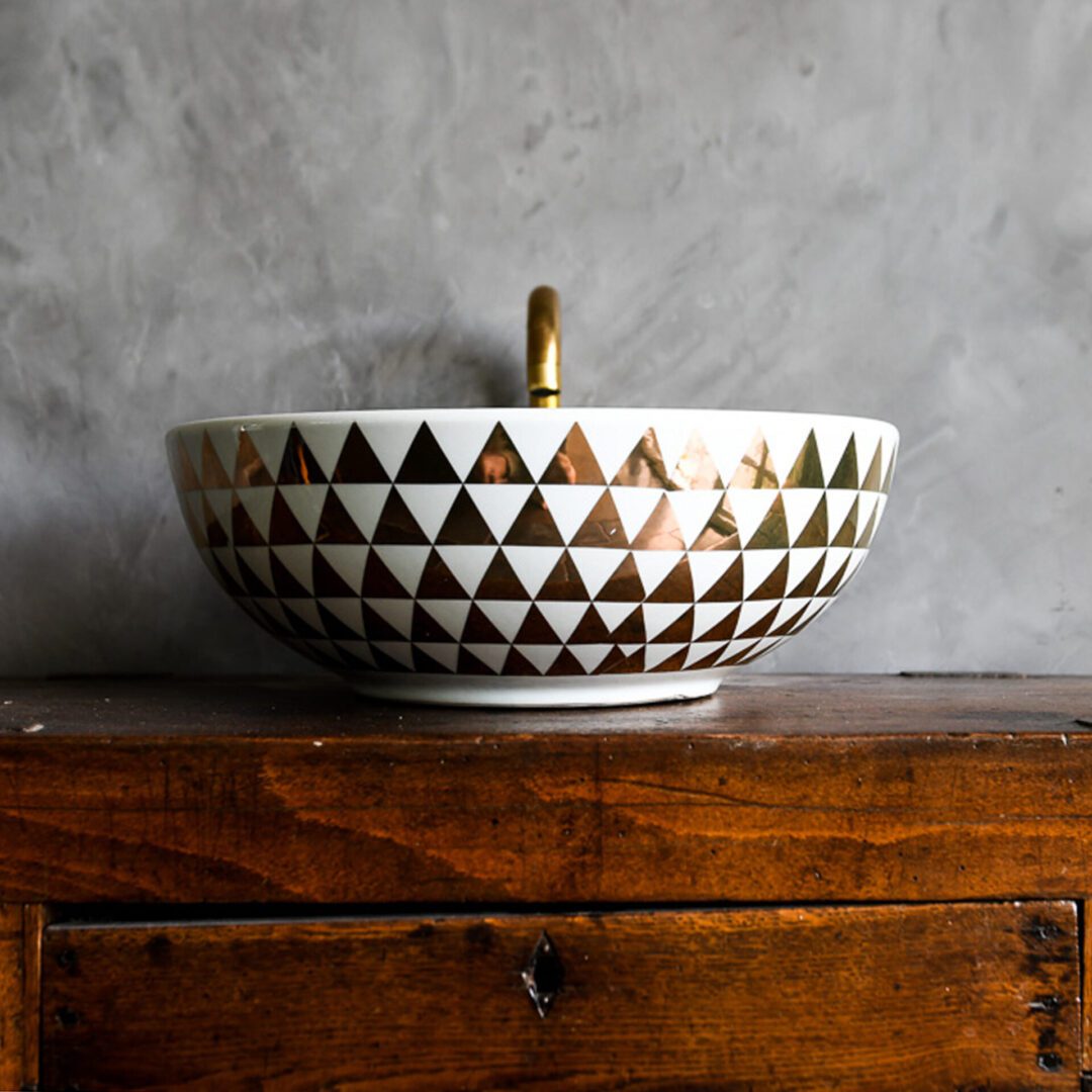 Ett grafiskt porslinshandfat i vitt med ett band av metalliskt gyllene trianglar runt hela utsidan. Det rena, geometriska mönstret ger ett modernt uttryck som känns lika självklart i ett stramt badrum som i en mer rustik miljö med trä och sten. Insidan är slät och vit, vilket gör att handfatet känns lugnt i vardagen men ändå blir ett tydligt blickfång på bänkskivan.
