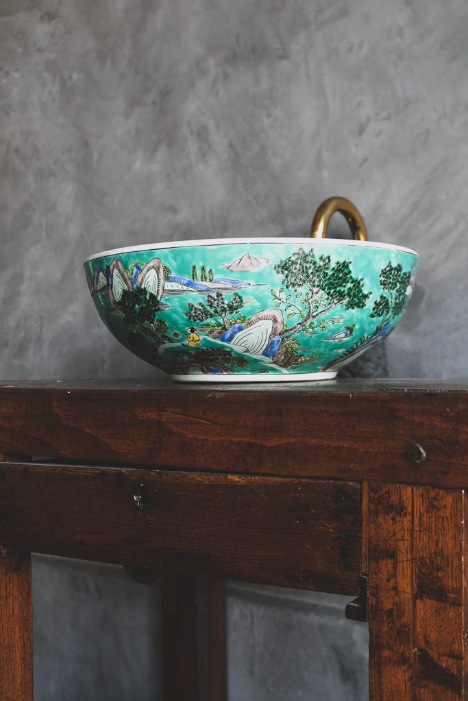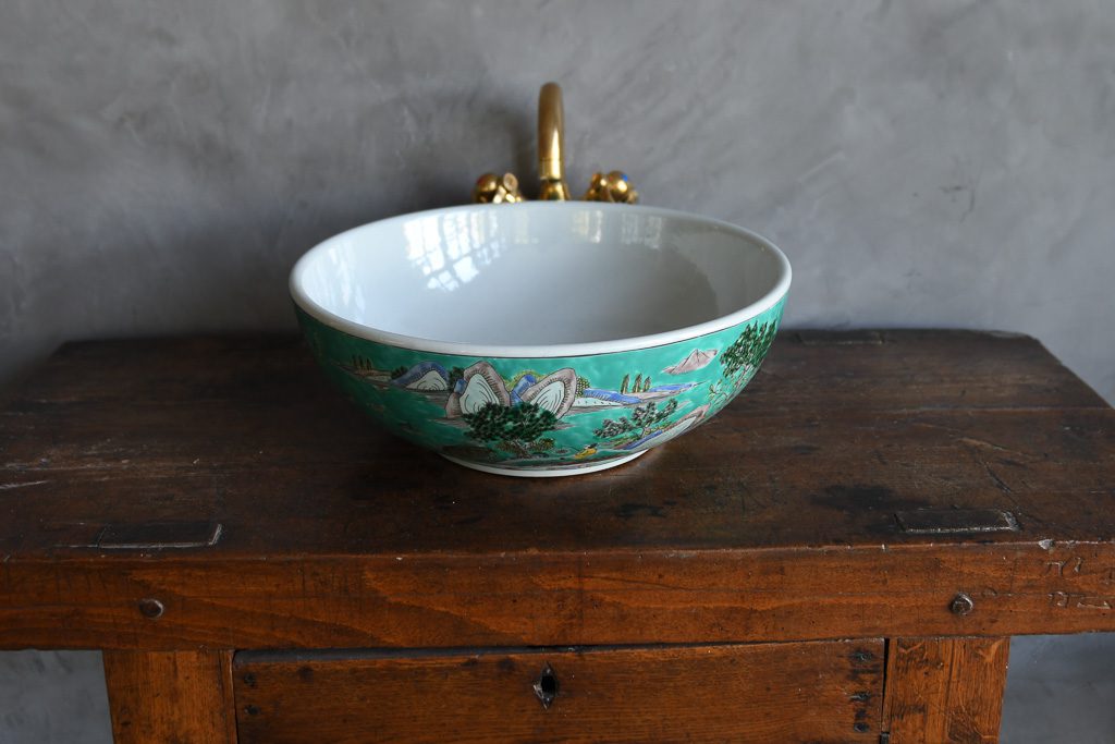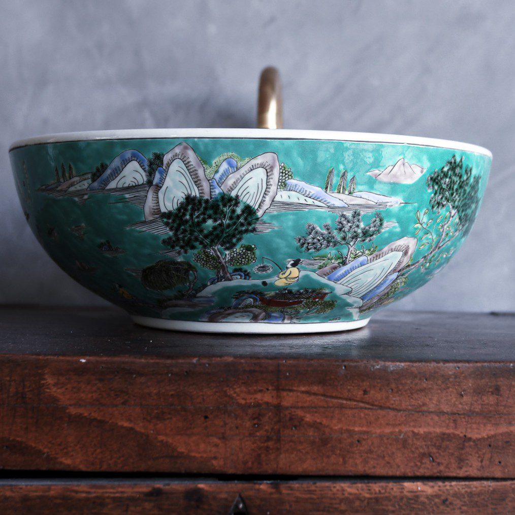 Ett handfat som lika gärna kunde vara en målning. På det vita porslinet breder ett detaljerat, handmålat landskap ut sig med berg, träd, vatten och små figurer som slingrar sig runt hela skålen. Färgerna drar åt turkos, grönt, blått och pudriga pasteller och ger en mjuk men uttrycksfull karaktär i rummet.