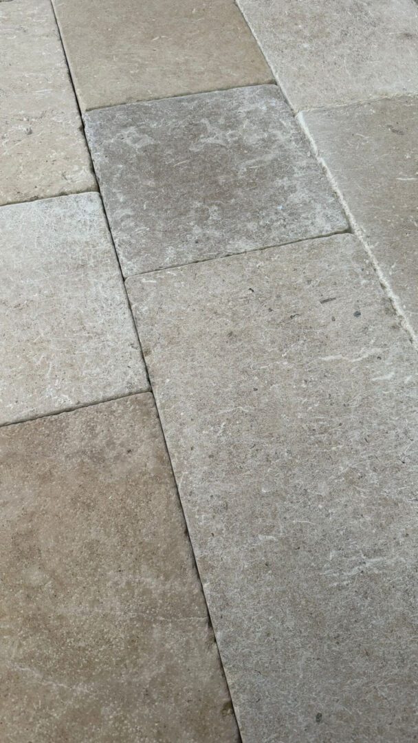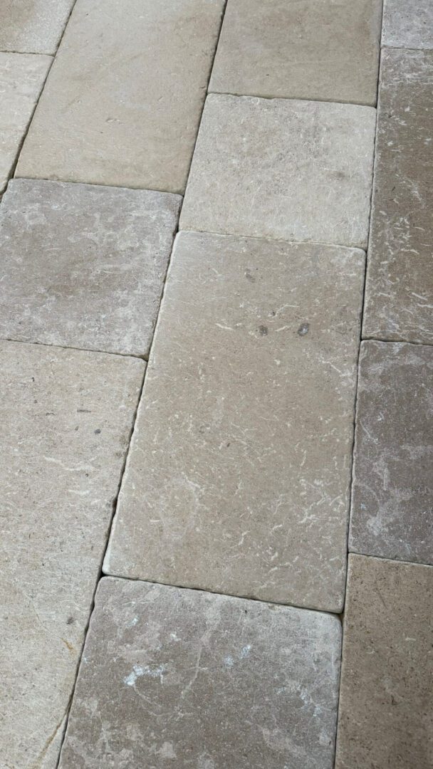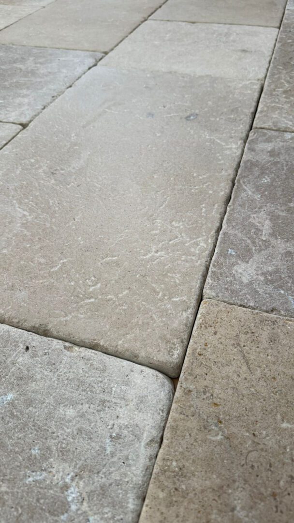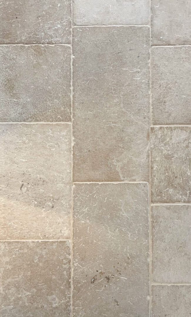 Kalksten Bourgogne Antique är en underbart mjuk sten där ytan är blanksliten på vissa stenar och matt på andra. Kanterna är handarbetade. Färgen mellan plattorna varierar mycket och håller sig inom crème, gyllene och nougat. Golvet har en sliten yta med olika strukturer på varje sten. Storleken är 40 x fallande. Fallande betyder att stenarna är lika breda men olika långa.