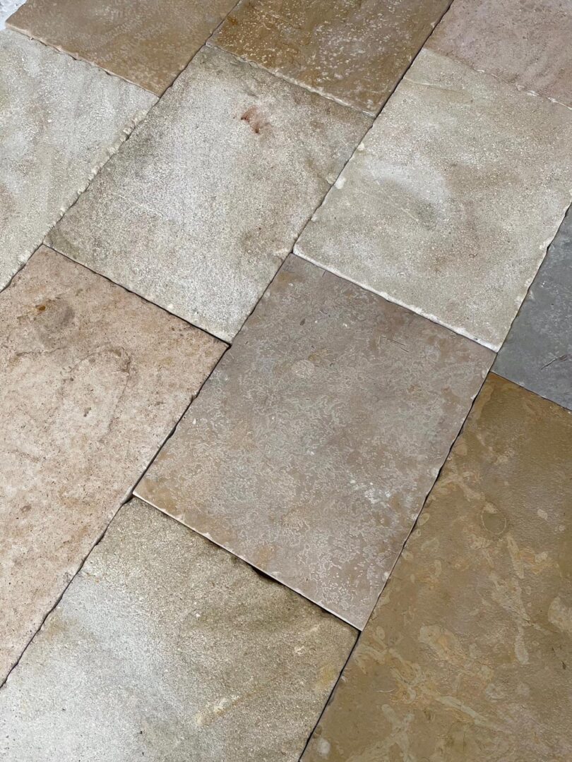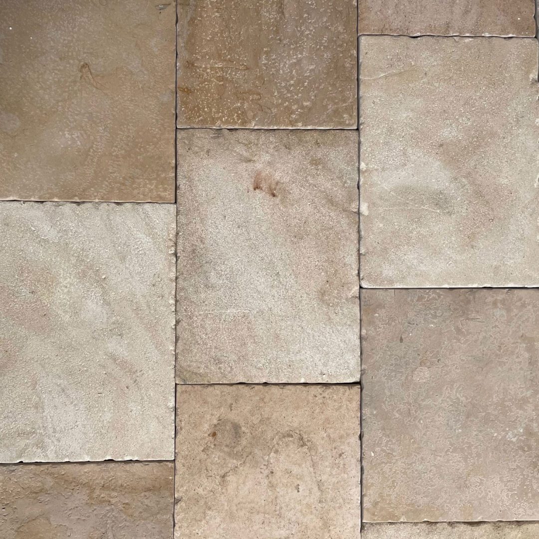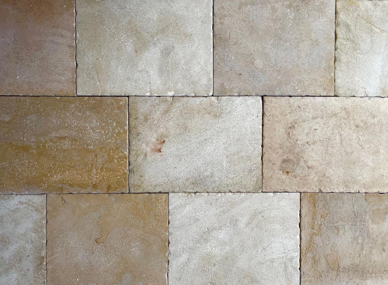Kalksten Bourgogne Antique är en underbart mjuk sten där ytan är blanksliten på vissa stenar och matt på andra. Kanterna är handarbetade. Färgen mellan plattorna varierar mycket och håller sig inom crème, gyllene och nougat. Golvet har en sliten yta med olika strukturer på varje sten.  Storleken är 40 x fallande . Fallande betyder att stenarna är lika breda men olika långa.