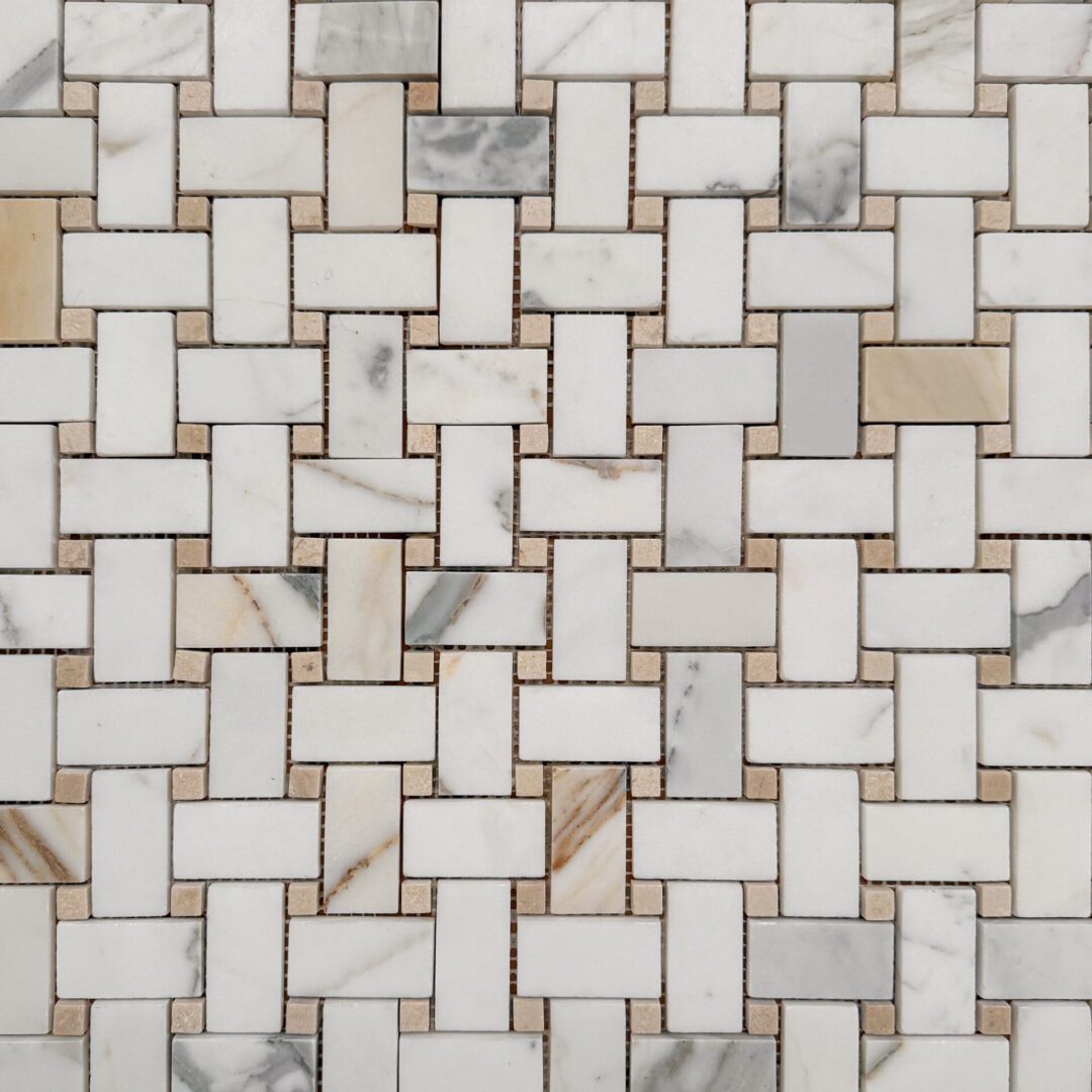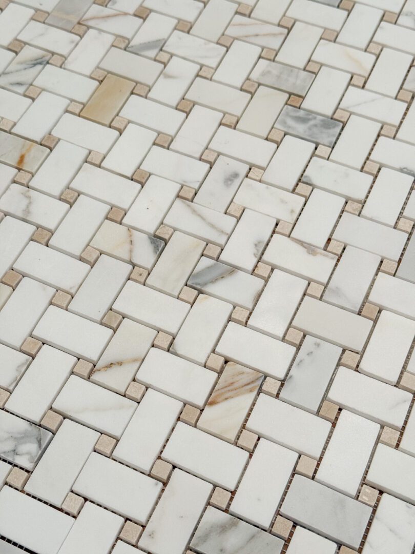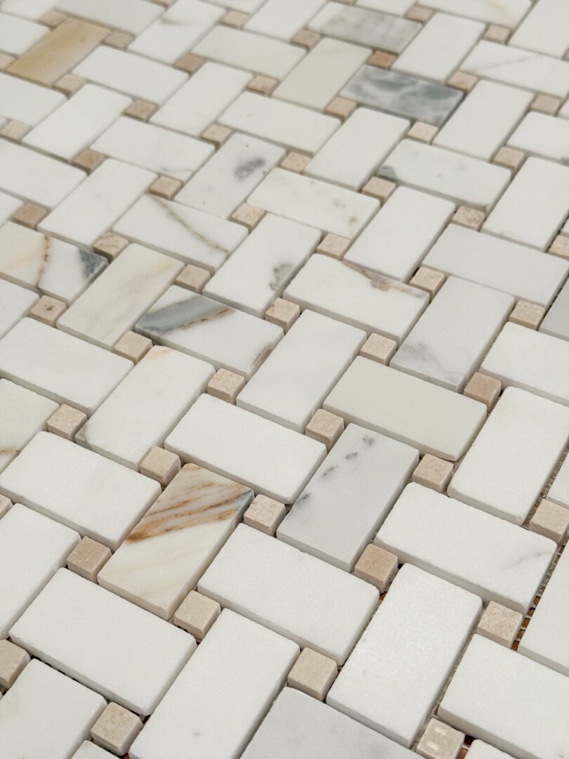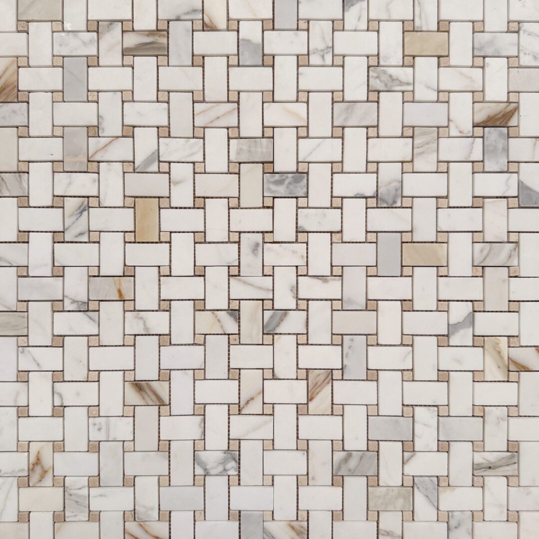 Basket Weave Calacatta. Mosaiken kan användas som både golv och vägg och kommer monterad på nät i storleken 30,5x 30,5×1 cm. Ytan är matt, så kallad finslipad och kanterna är raka, ej fasade.