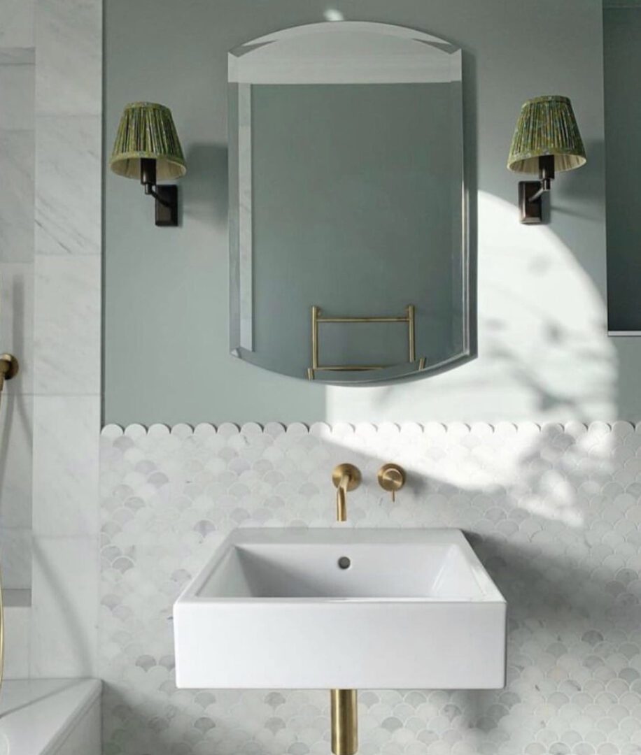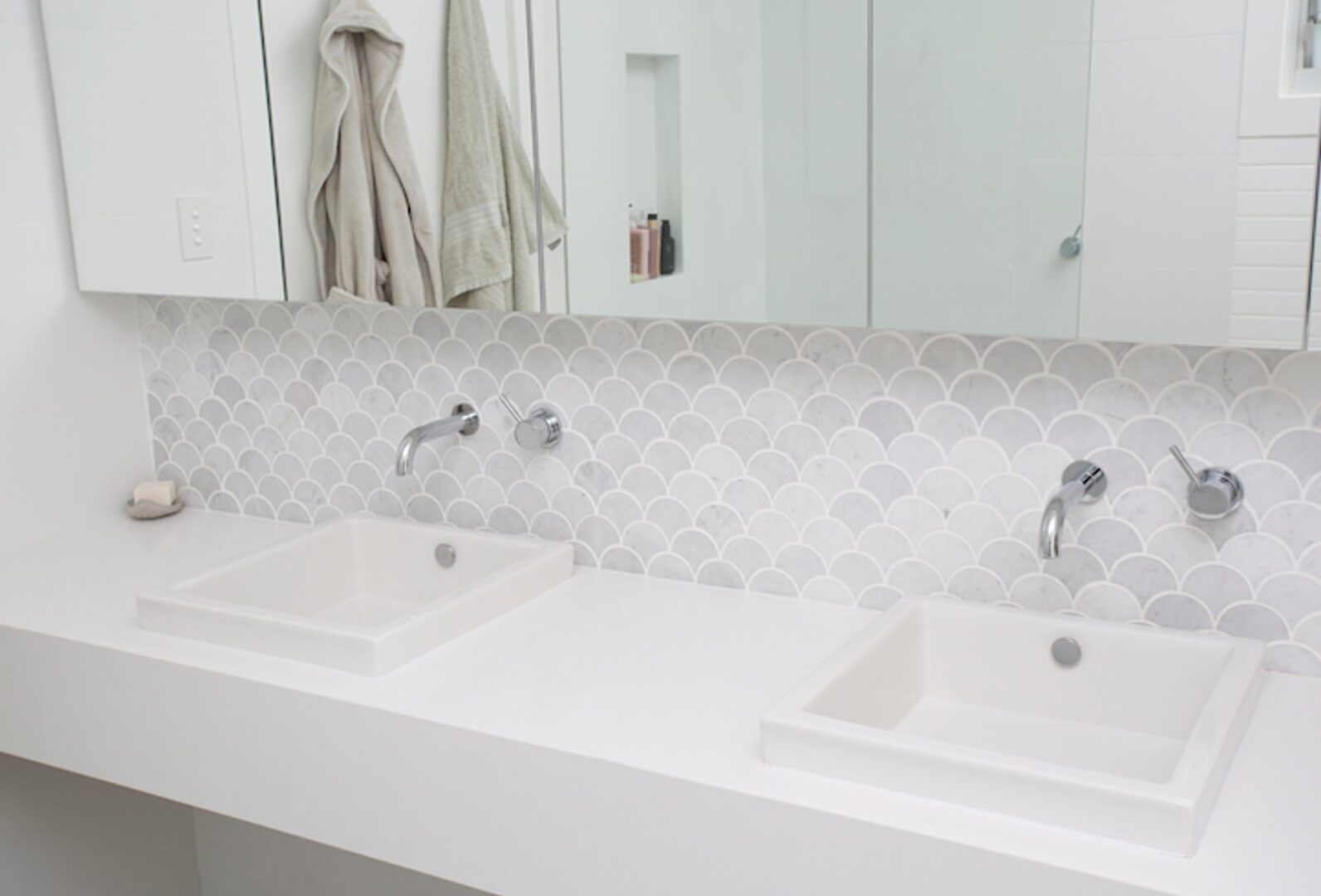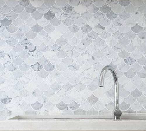Carrara marmor Fish scale mosaik, 10cm. Mosaiken kommer monterad på nät i måttet ca 30×30 cm. Carrara marmor med vit botten och lagom mycket grå marmoreringar, så som vi på stiltje tycker är vackrast. Ytan är matt, så kallad finslipad och kanterna är raka, ej fasade.