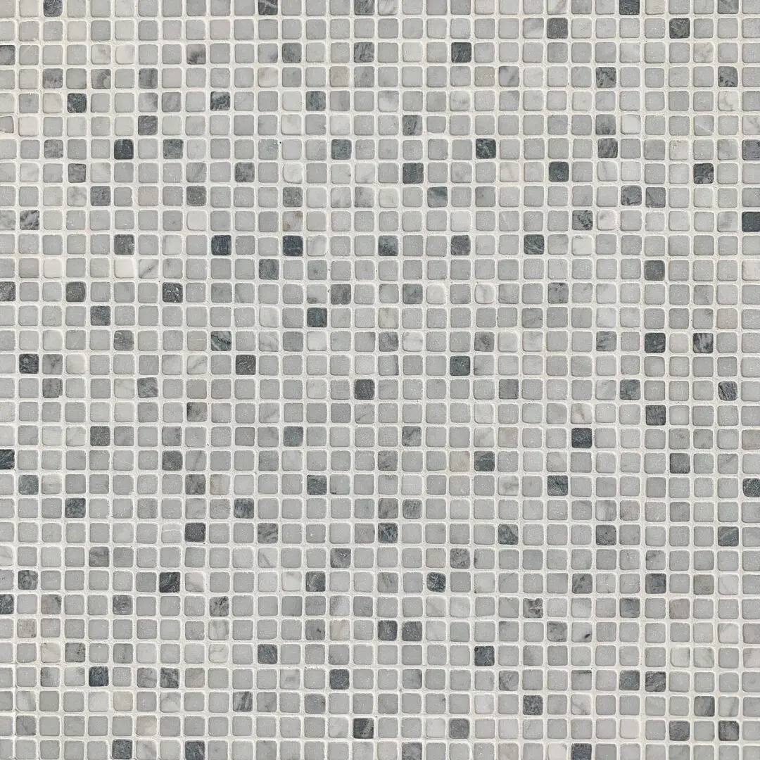 Mini mosaic tumbled carrara. De tumlade stenarna är 1x1cm och mosaiken kommer monterad på nät i storleken ca 30×30 cm. Mosaiken är underbar för fötterna att gå på, som massage för både fötter och själ. Tumlade material har också den fördelen att de redan är slitna. Mosaiken är fin att kombinera med våran vanliga carrara marmor.