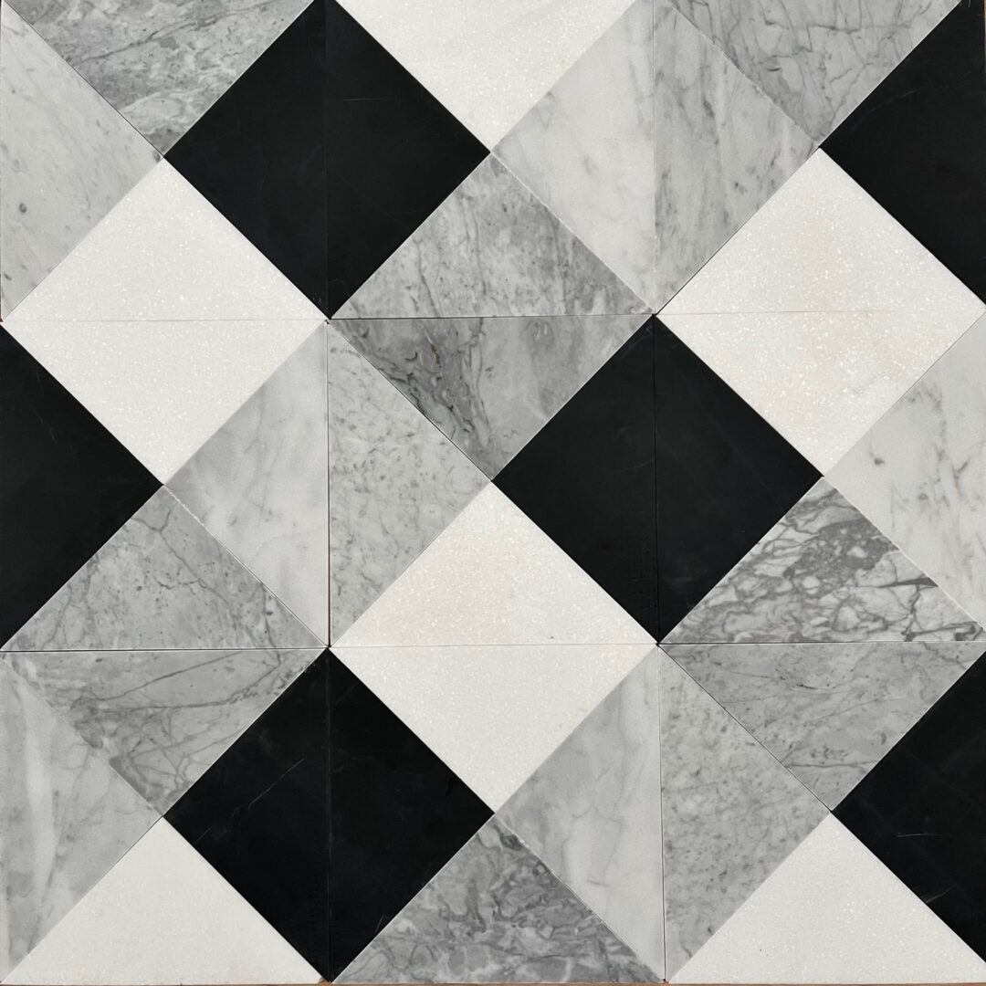 Chess 20×20 cm. En vacker kombination av svart, vit och två olika grå marmorstener i storleken 20x20x1 cm. Mosaiken fungerar bra både på golv och vägg.