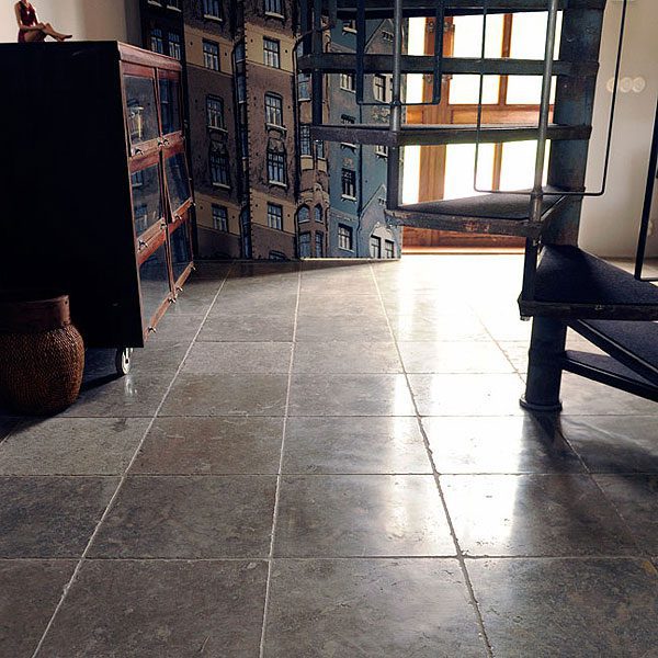hall med grå tumlad kalksten på golvet i blandade storlekar