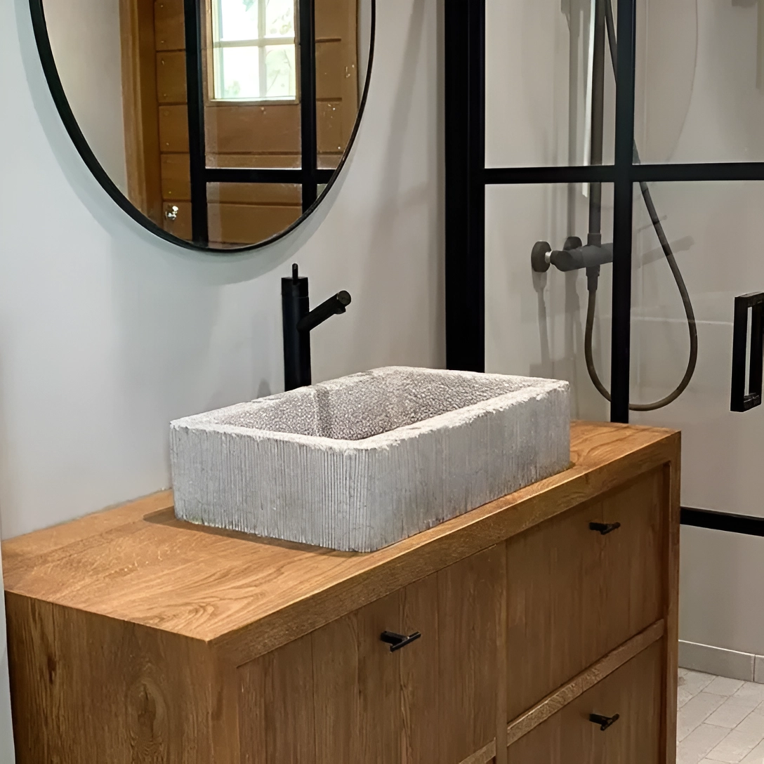 Kalkstenshandfat antique i egen Stilje design. Finns i grå eller cremefärgad sten med antik bearbetning, varje handfat är unikt.