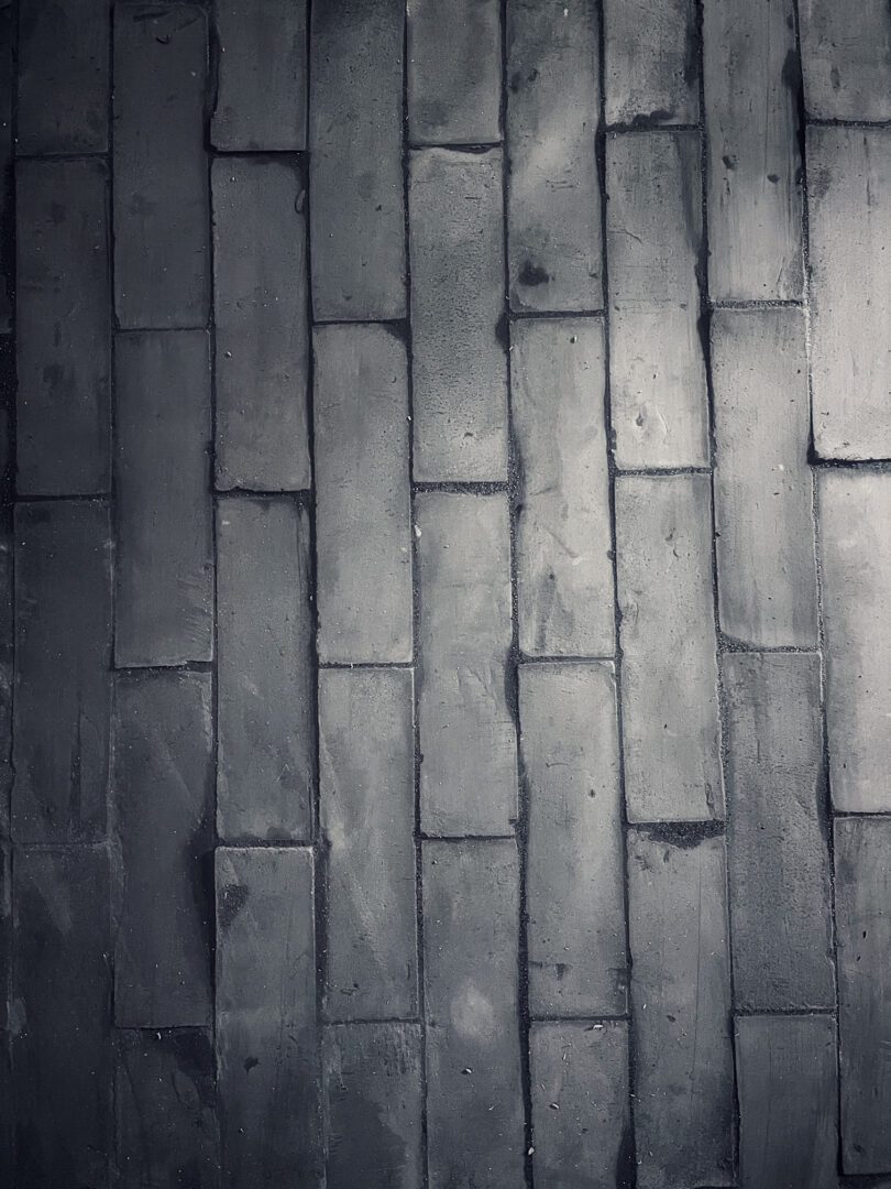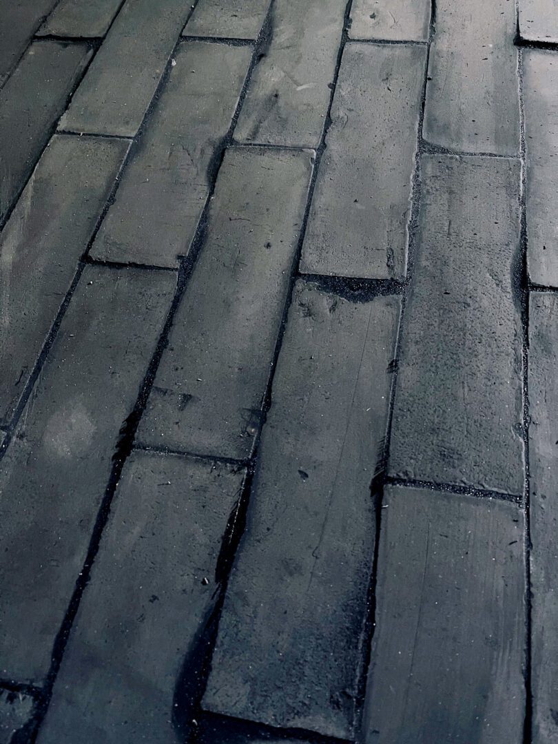 Tegel i svart lera 25 x 7 x ca 2 cm. Plattorna har skavanker och ojämnheter men det är just detta som gör dem så enormt vackra. De har en varm nyans, lite åt mörk choklad med röda stänk i leran. Dessa plattor måste läggas med bredare fog då plattorna ej är helt jämna i storlek.