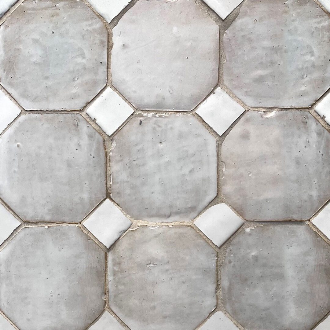 Zellige White Transparent/White fungerar bra för både golv och vägg. De stora plattorna är ca 10×10 cm och tjockleken är runt 15 mm. Inserten är något tunnare och de kommer som lösa plattor. Plattorna har mjuka kanter och de är inte raka.