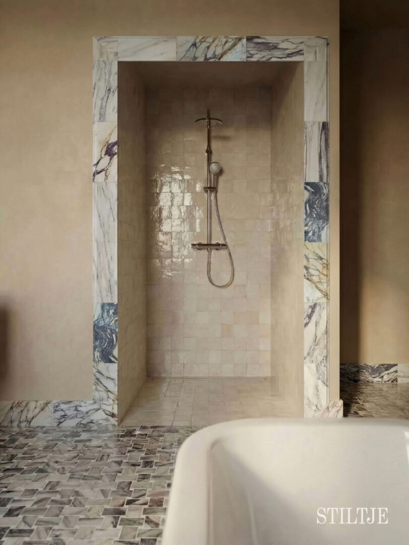 Zellige fungerar bra inne på duschväggarna och duschgolvet. Plattan fungerar också i ångbastu, kök.